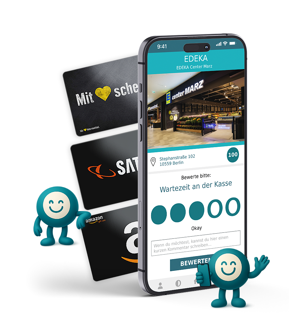 Die Möglichkeit, Bewertungen abzugeben und Punkte zu sammeln, erhältst du  bei unseren teilnehmenden Partnern, die daran interessiert sind, Produkte und Services jederzeit zu optimieren. Wenn du vor Ort bist, sendet dir die App eine Nachricht und schon kannst du deine Meinung abgeben. Die Bewertungen werden anonymisiert und natürlich erhältst du Prämien, egal ob du positiv oder negativ bewertest. Garantiert!
